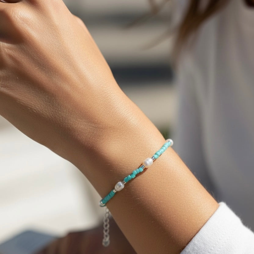 Dive into vibrant style with this cheerful turquoise bead bracelet, where natural gemstone charm meets the lustrous elegance of freshwater pearls.